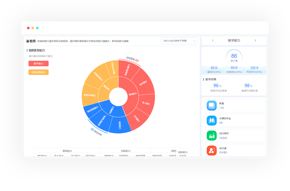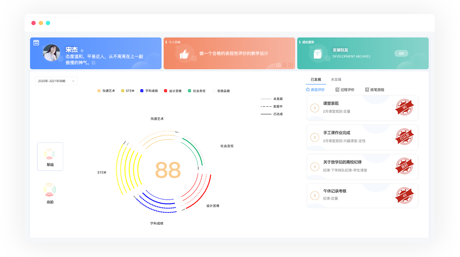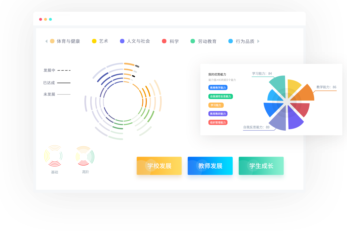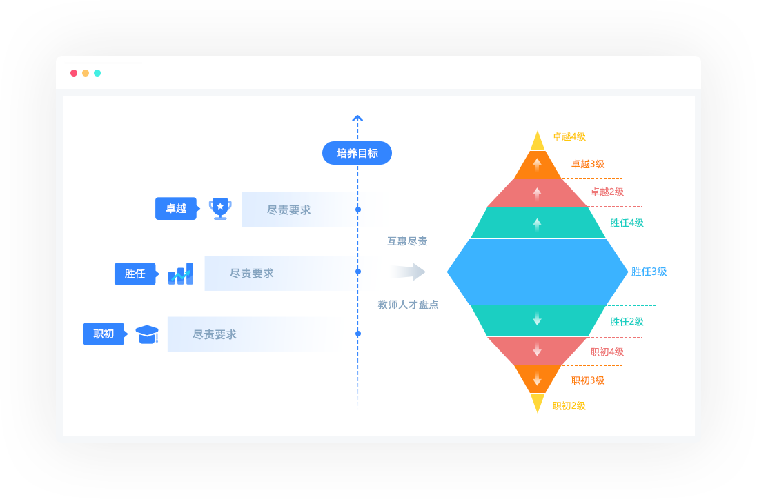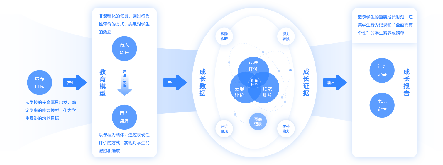 围绕学校整体育人目标,自上而下进行学生成长的顶层设计,以灵活的低代码平台和强大的大数据分析系统为支撑,以兼顾学生对学科知识的掌握以及通用能力培养的方式,为学校构建可落地执行的学生成长体系。