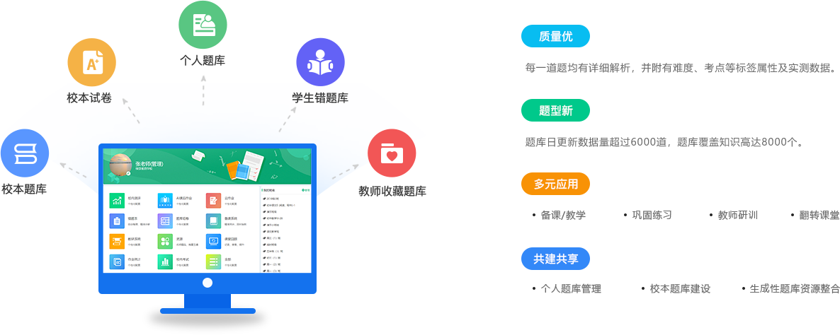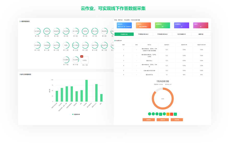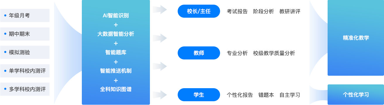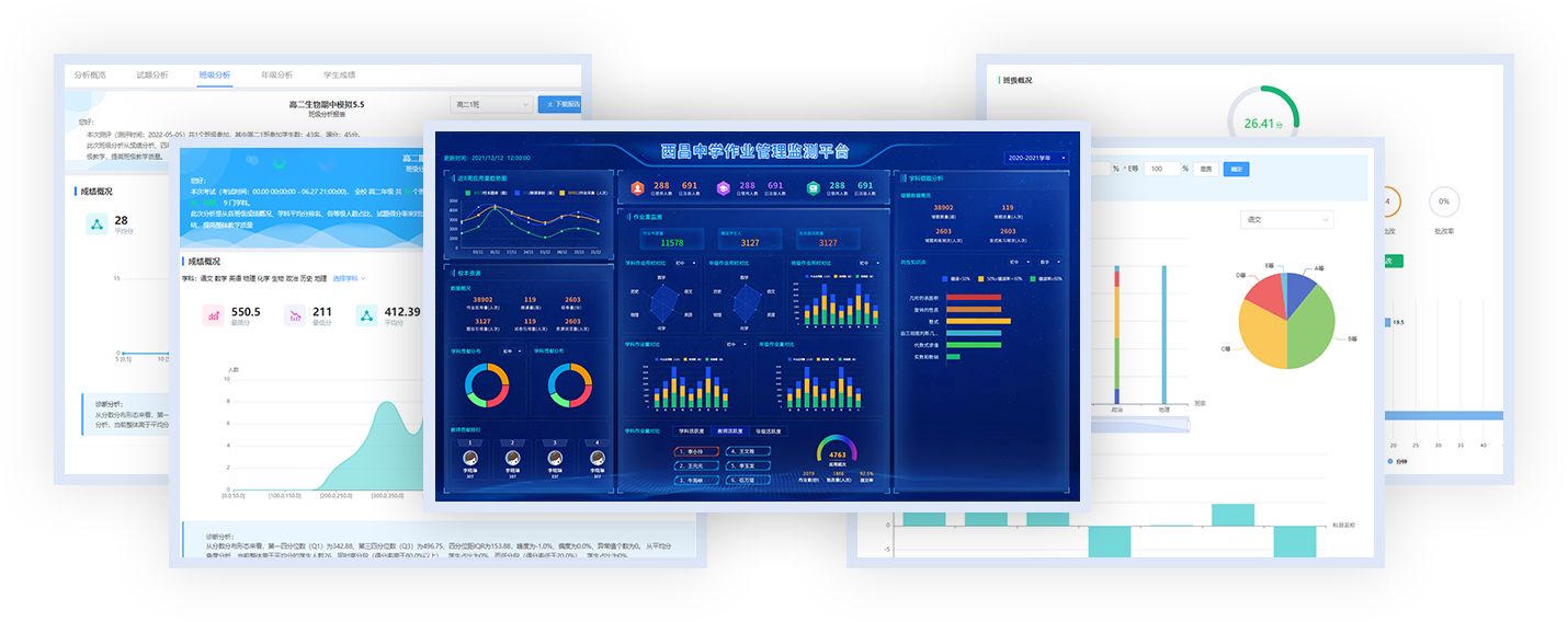 常态化采集学生作业、测评、课堂学情数据,深度挖掘数据价值,实现大数据驱动学校科学管、教师精准教、学生个性学,帮助学校管理者实时掌握学情动态,优化教学与管理策略,稳步提升学校整体教学质量。